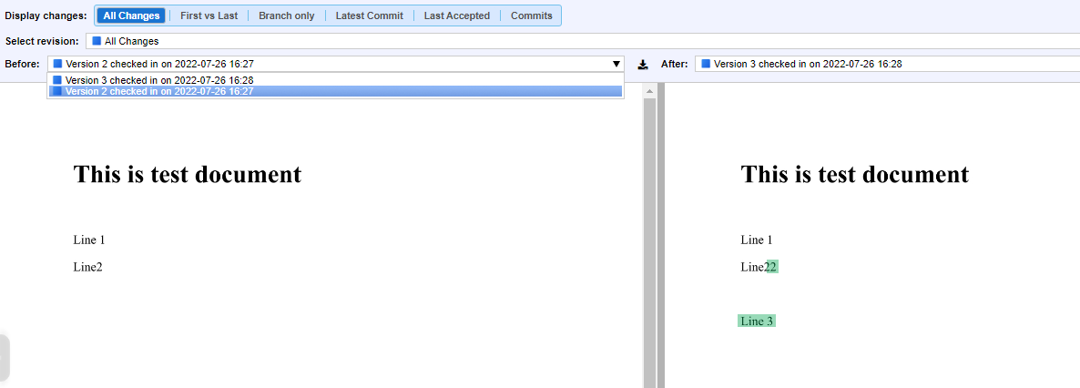 - It's recommended to use Collaborator server v.14.1 or higher to enable diffs calculation for cases, where there were changes in title of document (renaming) and such versions with different titles should be compared (older versions of Collaborator server are considered such versions with the different names as different documents).