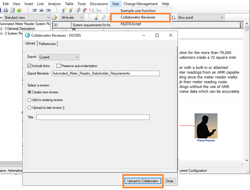 The Collaborator Add-On for DOORS makes it easy to create or update reviews with just a few clicks. When using the Add-On, there is no need to export and upload files manually to Collaborator - you can upload requirement documents directly from DOORS Classic.