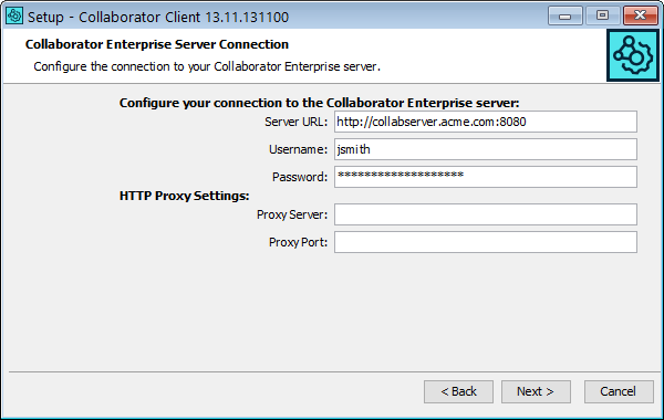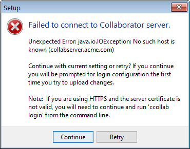 When run in unattended mode, the installer cannot verify the client's connection with the Collaborator server. You might have to manually configure the connection with the server. |