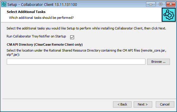 In order to enable integration with ClearCase Remote Client, you should launch client installer with administrator permissions on Windows. You need to specify the location of the Rational CM API jar files on your system. See details in Support for ClearCase Remote Client.