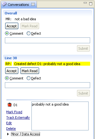 The Conversations View displays conversations on the most recently focused Review Screen or Compare Editor. For the Review Screen, the Conversations View shows the overall Review conversation. For the Compare Editor, the Conversations View shows all the conversations on the file.