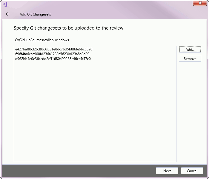 • Add changelists/changesets/shelvesets - Upload changes that have been submitted to source control repository. The created review will contain all files that belong to the specified changelists, changesets or shelvesets along with the history of changes between revisions.