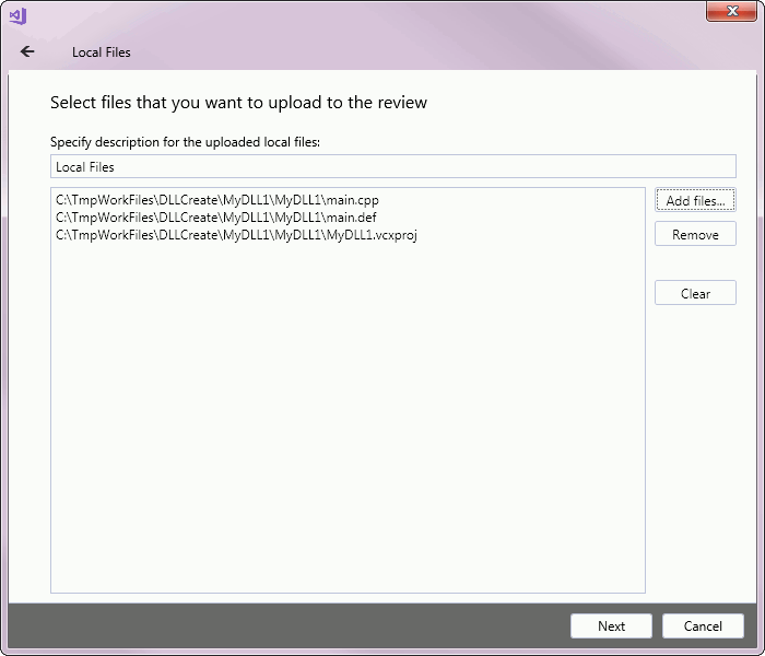 • Add local files - Upload arbitrary local files. The created review will contain only the selected files without their revision history.