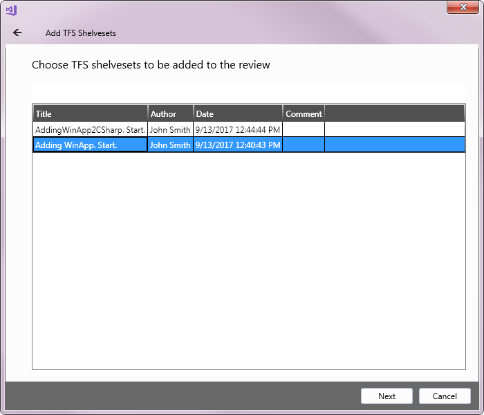 • For TFS shselvesets: Select the desired shelveset from the list. Use Ctrl or Shift for multiple selection.