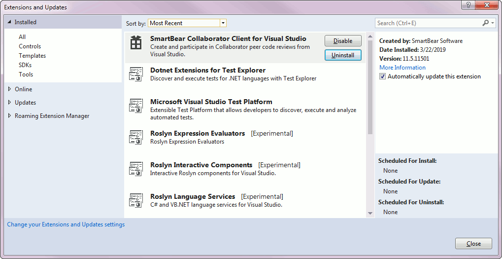 3. In the ensuing dialog, find the SmartBear Collaborator for Visual Studio extension and click Uninstall.
