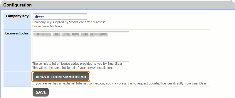 You can receive updated licenses from the SmartBear server after your initial license setup. To do this, simply click Update from SmartBear in the Configuration box.