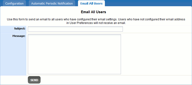 The Email All Users tab allows the administrator to send an email to all users in the system. This is easier than maintaining a separate email mailing list for users.
