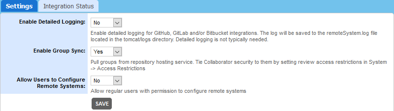 The Settings tab holds a number of global settings affecting remote system integrations: