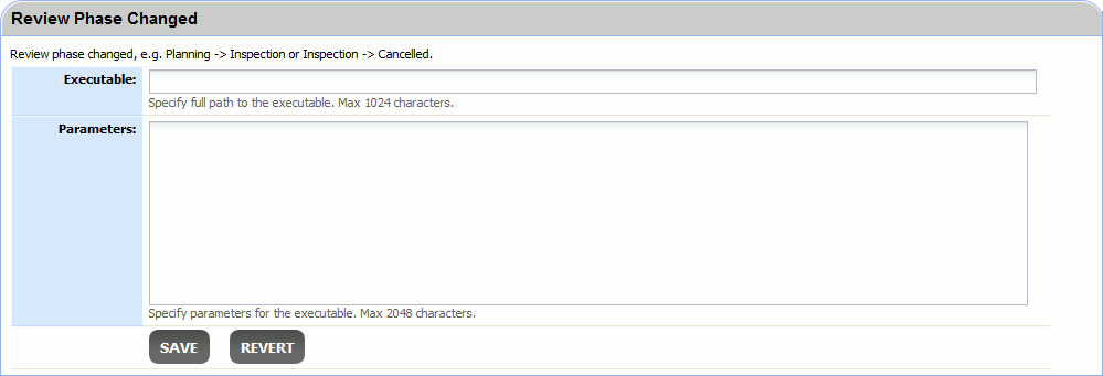• Review Phase Changed – Review phase changed: for instance, from Planning to Inspection, or from Inspection to Canceled.