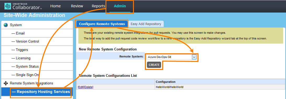 On the Collaborator main toolbar, click ADMIN, and then select Repository Hosting Services from the tree on the left. Then switch to the Configure Remote Systems tab.