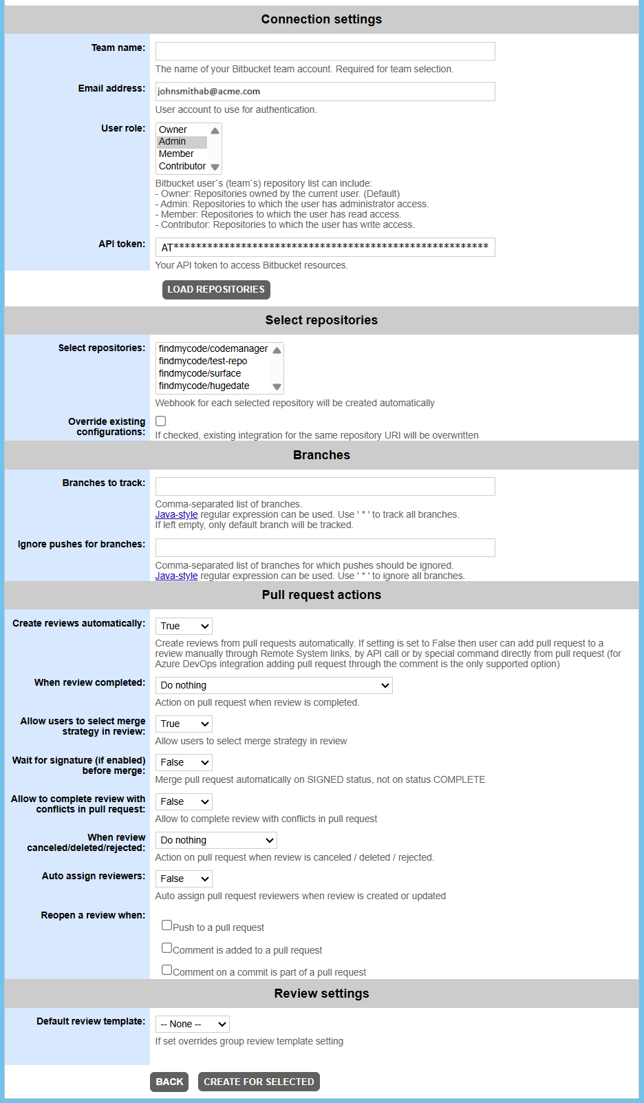 If any of the repositories were chosen, the wizard will display the Create for selected button below the settings section.