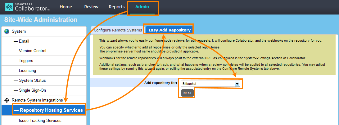 On the Collaborator main toolbar, click ADMIN, and then select Repository Hosting Services from the tree on the left. Then switch to the Easy Add Repository tab.