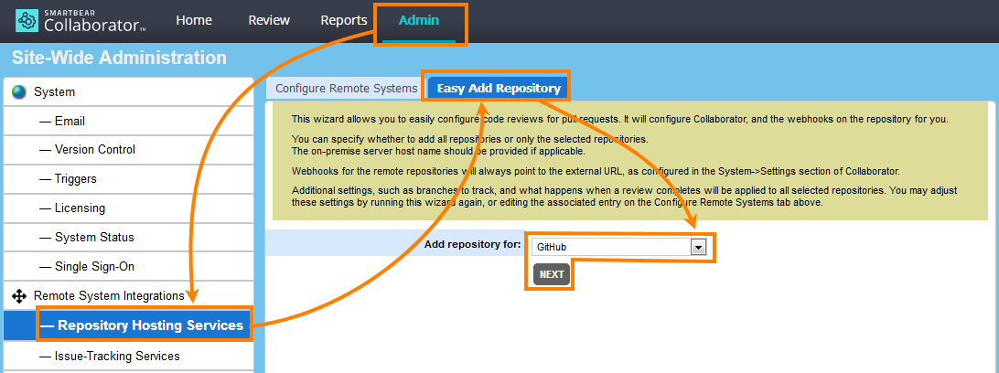 On the Collaborator main toolbar, click ADMIN, and then select Repository Hosting Services from the tree on the left. Then switch to the Configure Remote Systems tab.