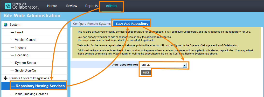 On the Collaborator main toolbar, click ADMIN, and then select Repository Hosting Services from the tree on the left. Then switch to the Configure Remote Systems tab.