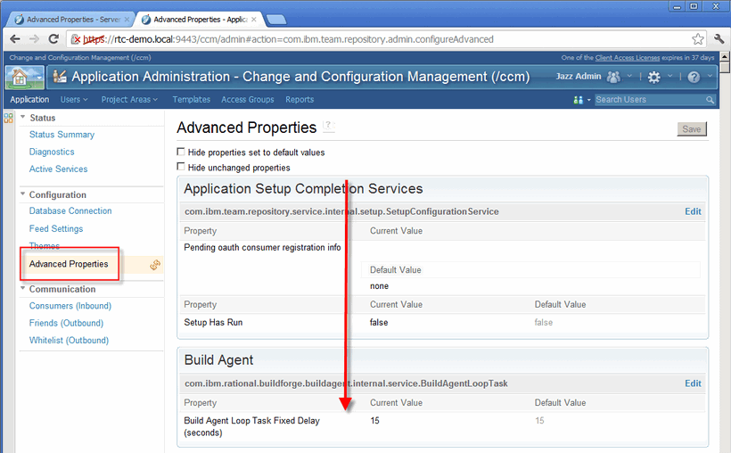 1. Login to the Change and Configuration Manager at https://$Your_Jazz_server/ccm/admin, for example, https://rtc-demo.local:9443/ccm/admin.