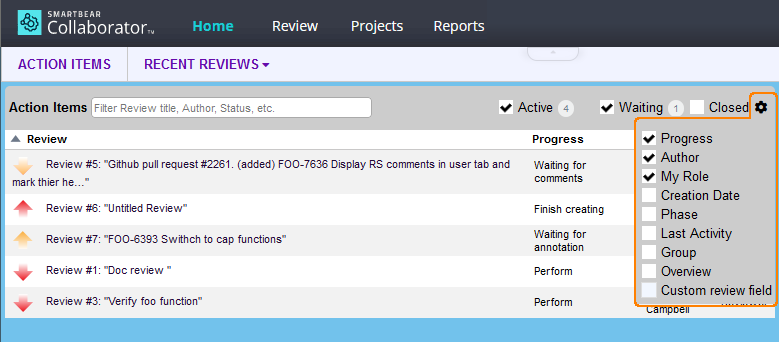 Additionally, you can sort action items by clicking on the column headers: Review, Progress, Author, My Role and so on.