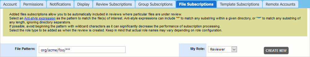File Subscriptions allow you to automatically subscribe and be included in reviews where a particular file is under a review. Choose your role type (Reviewer, Observer, or Moderator) in the My Role field. In the File Pattern field, enter an Ant-style expression as the pattern to match the file(s) of interest. The expression will be matched to the file path and repository name; it will not look for matches in the complete repository path with URL and other server descriptions. Ant-style expressions can include "*" to match any substring within a given directory, or "**" to match any substring of any length, ignoring directory separators. If possible, avoid beginning the pattern with wildcard characters as it can significantly decrease the performance of subscription processing.