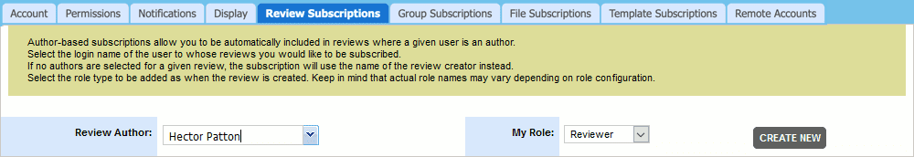 Review Subscriptions allow you to automatically subscribe and be included in reviews with a preferred author. In the Review Author field, select the login name of the user to whose reviews you would like to be subscribed. If no authors are selected for a given review, the subscription will use the name of the review creator instead - unless the review creator is flagged as a system admin. Choose your role type (Reviewer, Observer, or Moderator) in the review in the My Role field. Keep in mind that actual role names may vary depending on your role configuration.