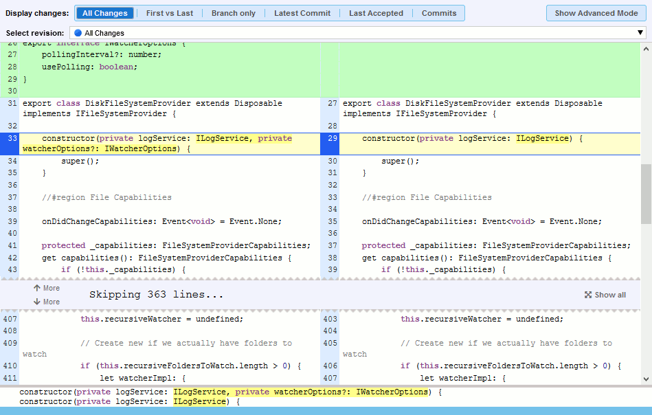 If the Skip Unchanged option is enabled, unchanged lines will be hidden in the Diff Viewer as shown below: