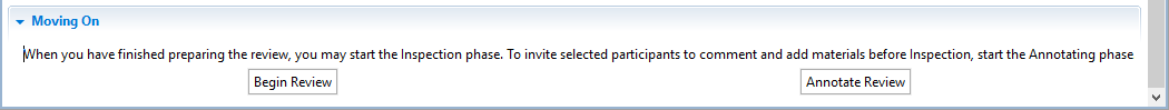 To move the review to the Annotating phase, click the Annotate Review button in the Moving On section. To start the Inspection phase, click the Begin Review button.