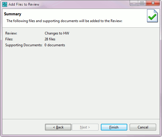 6. The Summary screen will show files and documents to be added to the review. Click Finish to create the review or Back to make changes.