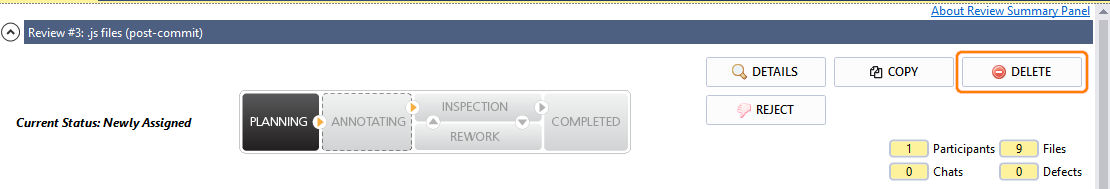 While a review is in the Planning phase, it can be deleted. Deleting becomes impossible once the review is moved to the Annotating or Inspection phase; such reviews can only be cancelled or rejected.