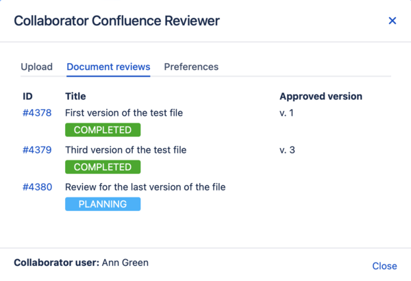 To check previous created Collaborator reviews for the current Confluence document open Confluence plugin and go to the Documents tab. There are two options when user can see list of the reviews: in the Preferences tab user is logged in and/or Show reviews to everyone option is enabled in the Space configuration.