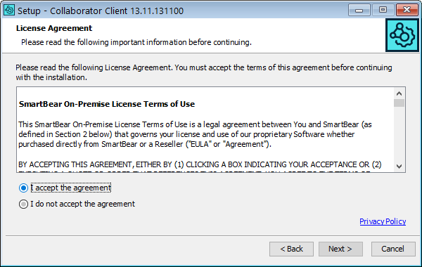 In order to enable integration with ClearCase Remote Client, you should launch client installer with administrator permissions on Windows. You need to specify the location of the Rational CM API jar files on your system. See details in Support for ClearCase Remote Client.