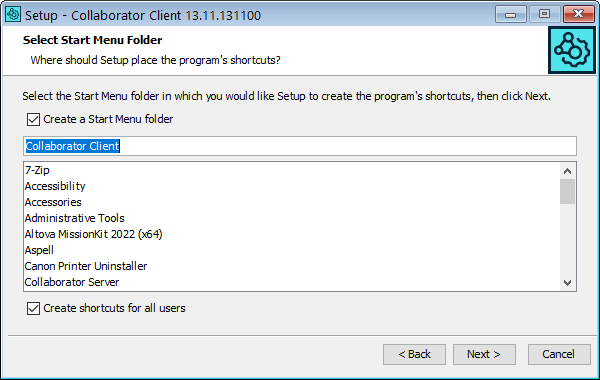 The next screen lets you configure how and if your Start Menu (Windows only) is modified. This does not affect the behavior of the command-line client itself:
