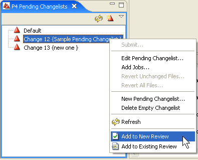 Right-click on one or more Pending Changelists in the P4 Pending Changelists view and select Add to New Review or Add to Existing Review.