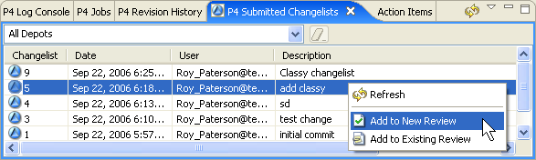 Right-click on one or more Submitted Changelists in the P4 Submitted Changelists view and select Add to New Review or Add to Existing Review.