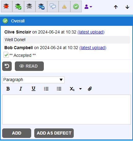 At the top of the chat pane, you will find a series of buttons that control whether or not certain types of comments/defects appear in full or in collapsed states (to save viewing space). Note that defects, count as unread comments until they are accepted/marked read. The combination of these toolbar options acts as a filter of what comments/defects will be collapsed in the chat pane.