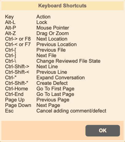 The Diff Viewer is completely navigable from the keyboard. You can move around the file, jump to changes, expand conversation, make defects and mark file as reviewed/un-reviewed. To get the list of keyboard shortcuts, click the