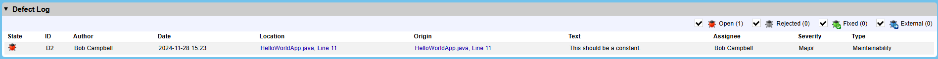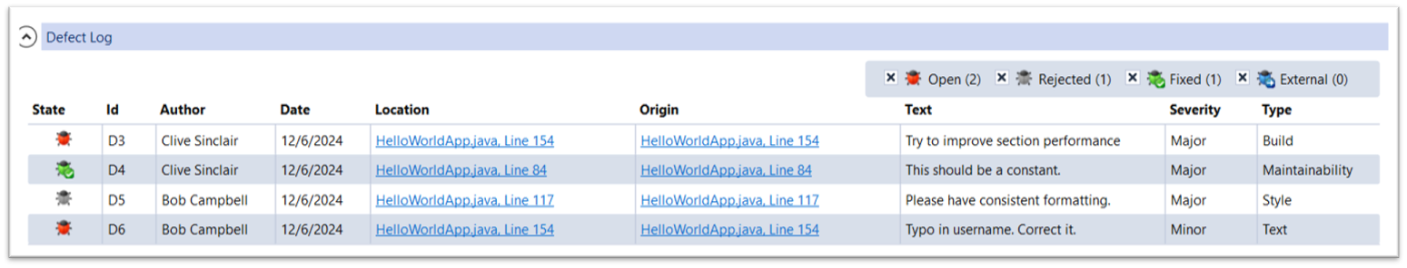 Initially, the log will be empty. As defects are created for the review as a whole or on individual files and line numbers, all defects are collected and listed here. All defect custom fields are shown in the table. If review template allows assigning defects to specific participants, the exact participant responsible for fixing the defect will also be shown in the table.