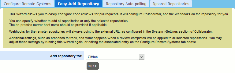 Alternatively, you may configure Collaborator server to automatically check if any new repositories were found on the specified remote hosting servers and notify administrators suggesting to create integrations with these newly created repositories. This can be performed on the Repository Auto-Polling tab.