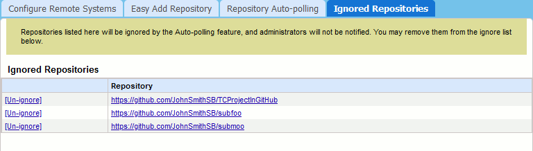 The Ignored Repositories tab lists the repositories that should not be affected by the auto-polling feature, so that Collaborator will not suggest creating integrations for those repositories.