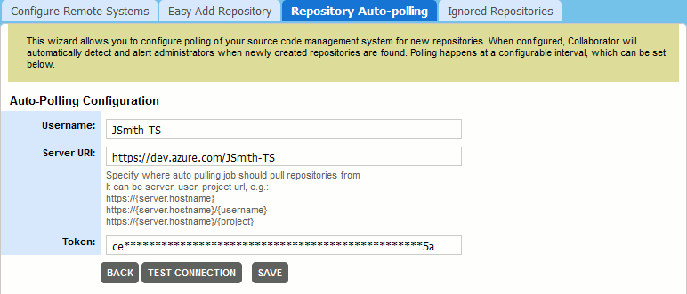 Setting Description Username Required. Specifies the account name to use for authentication. Server URI Required. The URI of Azure DevOps server, user or project to be polled for new repositories. Token