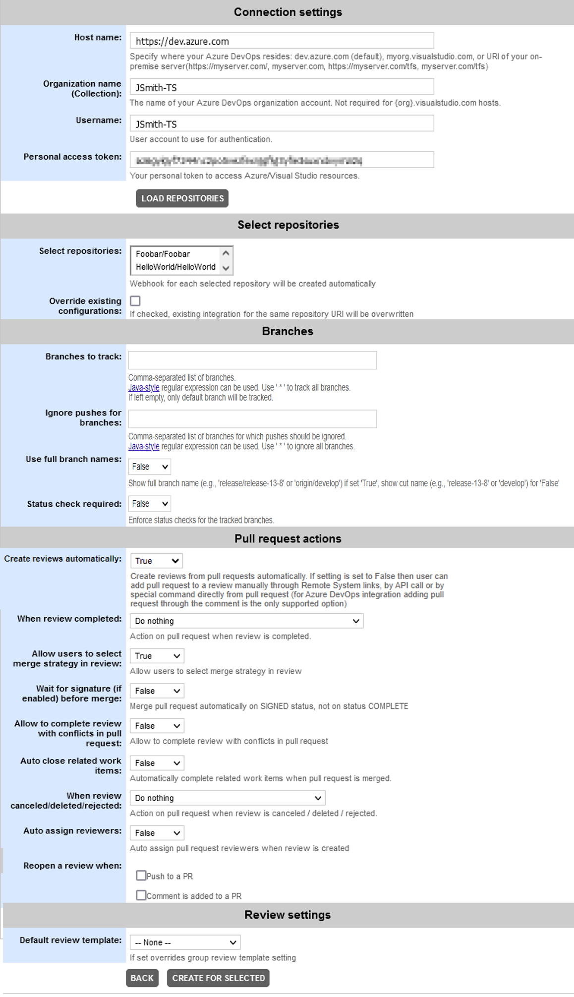 Sections above describe how to add integrations for existing repositories. When some new repositories are created on a server, you may integrate them manually. Alternatively, you can setup Azure DevOps auto-polling configuration that will periodically look for new repositories on the specified server, user or project and suggest creating integrations for them.