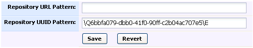 Option Description Repository URL Pattern Match on the configured repository URL of the client. This is not very reliable because clients may have various network configurations that make the URL look different. It is usually far better to use the Repository UUID Pattern. Repository UUID Pattern Match on the Repository UUIDreturned from running thesvn infocommand. This is a unique ID generated by every Subversion repository, and usually works perfectly for identifying uploads to this Subversion server. When a version control server entry is created automatically, this is filled in withRepository UUIDobtained from the client. -