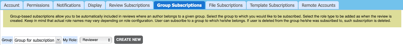 Group-based Subscriptions allow you to be automatically included in reviews where an author belongs to a given group at the moment, when review is created. In the Group field, the group to which you would like to be subscribed and where you are a member. Choose your role type (Reviewer, Observer, or Moderator) in the review in the My Role field. Keep in mind that actual role names may vary depending on your role configuration. If user is deleted from the group he/she was subscribed to, such subscription is deleted. Changes in group such as adding/removing users to/from group affect subscription behavior only for new review (created after changes in group). Subscription is applied to directly selected group only: child groups, if any, are ignored.