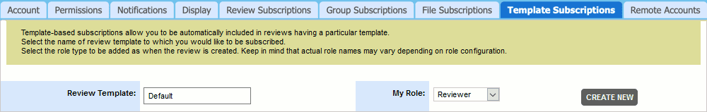 Template Subscriptions allow you to automatically subscribe and be included in reviews having a particular template. Select the name of a template you would like to subscribe to in the Review Template field and specify your desired role type (Reviewer, Observer, or Moderator) in the My Role field.