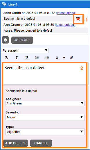 Review participants could convert only their own comments. Newly created defect is added to the end of conversation, with new date-time.