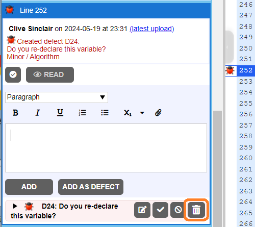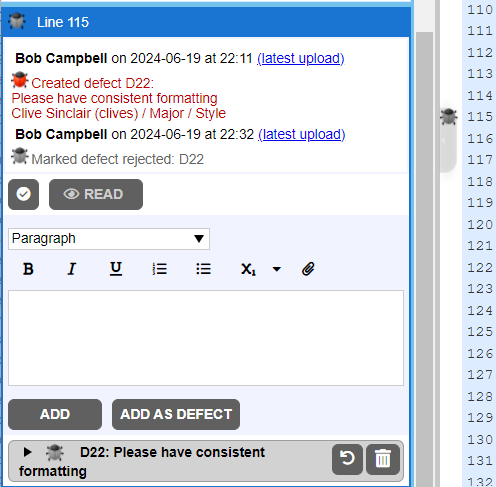 When you want to indicate that there is a problem that needs to be fixed rather than simply discussed you open a defect. Do this using the Add as defect button below the comment field: