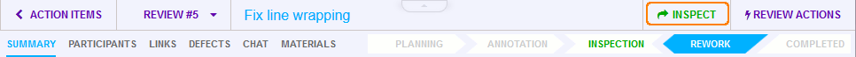 In the Rework phase, the authors are the only roles active so that they may fix the defects found in the Inspection phase. When the authors are satisfied with their fixes, the fixes are uploaded into the review. The authors then indicate they are ready for the fixes to be validated by clicking the Send to Inspection button.
