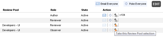 For each Review Pool assignment, the Participants section of the Review Screen displays a Take button, which is enabled for eligible participants (members of the Review Pool group). The first eligible participant to go the the Review Screen and select the Take button becomes a participant with the given Role in the Review.