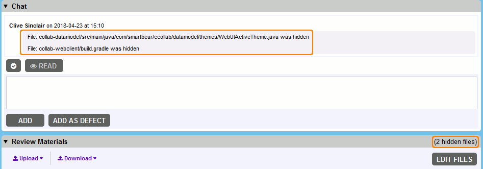 Once a file is hidden or unhidden, a comment is made in the Chat section which says that a particular file was excluded or included in the review. Also the counter of hidden files is incremented or decremented, respectively.