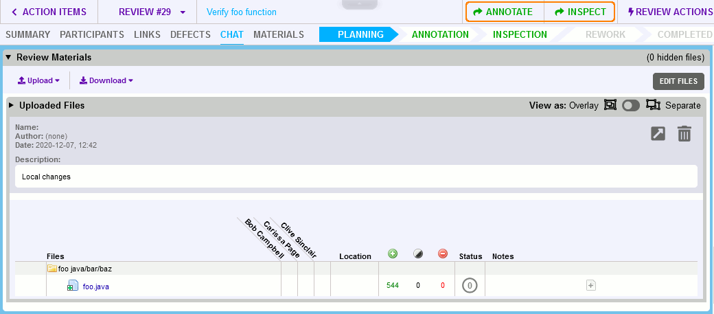 To move the review to the Annotating phase, click the Annotate button in the review header. To start the Inspection phase, click the Inspect button.