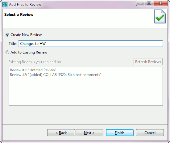 On the Select a Review screen, select Create New Review and type its title in the Title box. Alternatively, if you don't want to create a new review, select Add to Existing Review and select a review from the list below. Click Next.