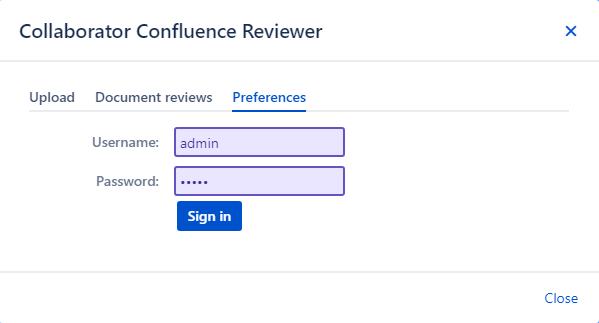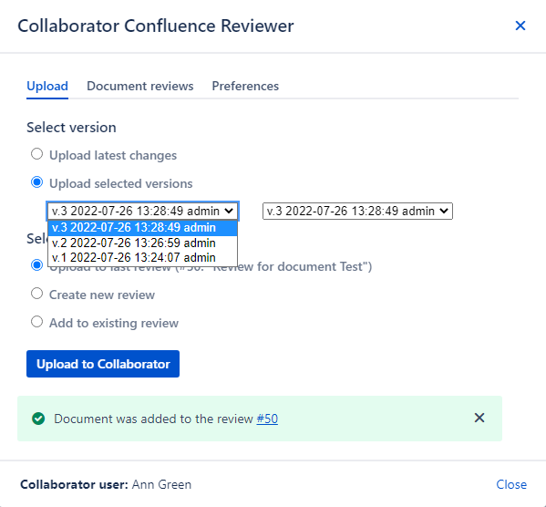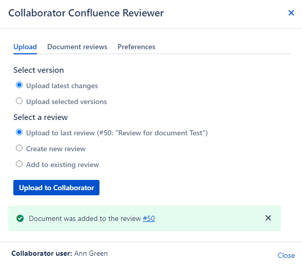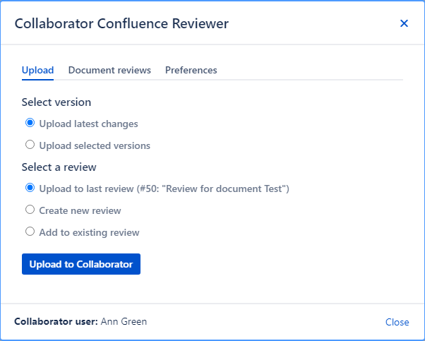 - Once username and password are saved, upload tab is opened. Specify whether to upload Confluence document to the last review that was created, to create a new review or to upload it to some existing review.