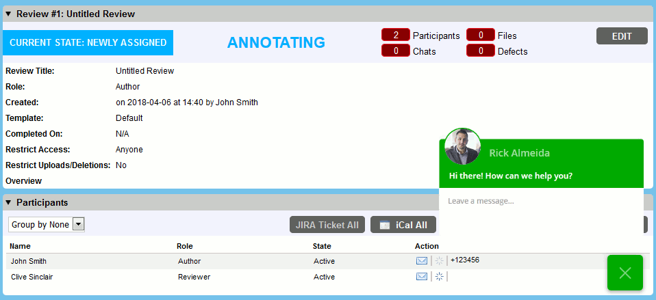 To help trial users have a better experience of using Collaborator and solve common issues, the trial version of Collaborator includes a built-in chat. You can use the chat to contact our team directly from the product. To ask for assistance, click the Chat button in the bottom-right corner of Collaborator Web Interface and enter your question. You will get a response from our Customer Care team.